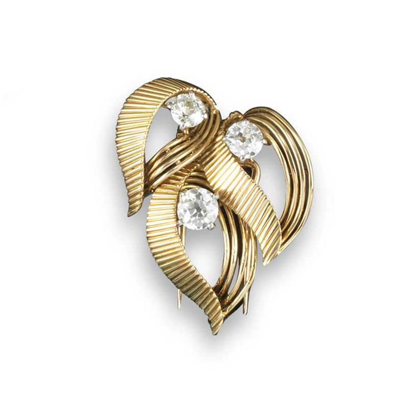 A diamond set gold clip brooch by Cartier (Monture), set with three graduated old circular cut diamonds to the yellow gold scroll mount. Signed Cartier Monture, inventory number V6153. French control marks. Cartier box.