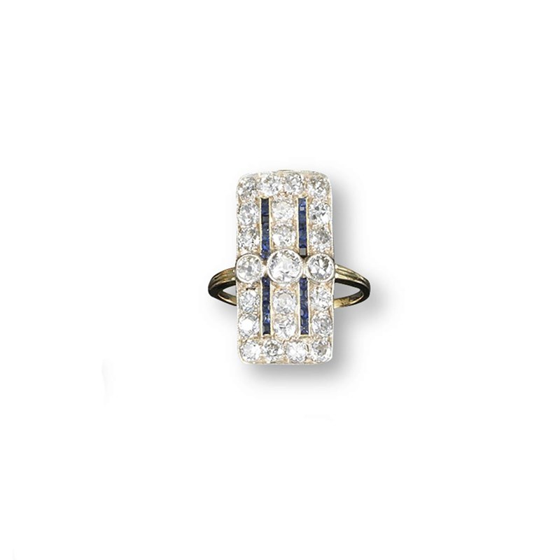 An Edwardian diamond and sapphire set platinum and gold rectangular plaque ring, pave set with circular cut diamonds, a central line of three graduated and larger circular cut diamonds, and two vertical lines of calibre cut sapphires (one missing). Size O.