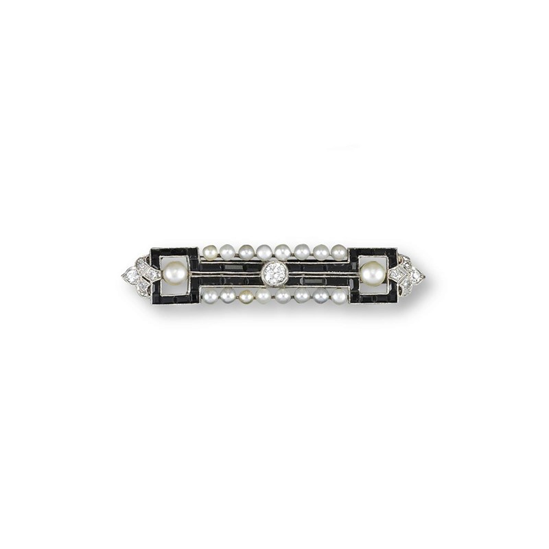An early 20th century pearl, diamond and black onyx brooch, the geometric design with fleur de lys terminals and a central cushion shaped diamond, millgrain set in platinum. French control marks. 5.5cm wide.