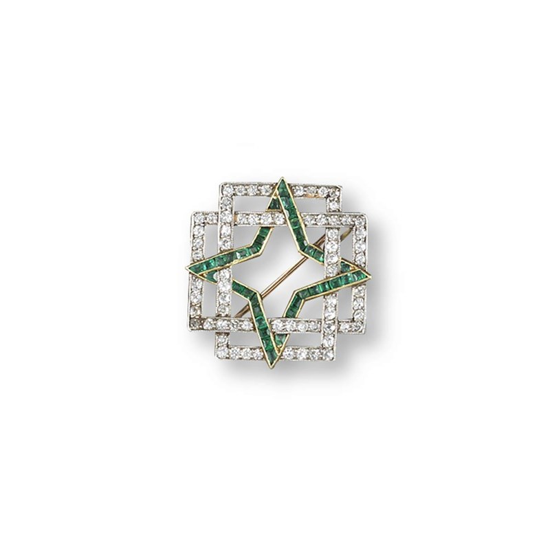 An Art Deco diamond and emerald set geometric design brooch, formed with two interlocking rectangulars each millegrain set with circular cut diamonds and a stylised star form center section set with calibre cut emeralds in platinum and gold. Fitted case.