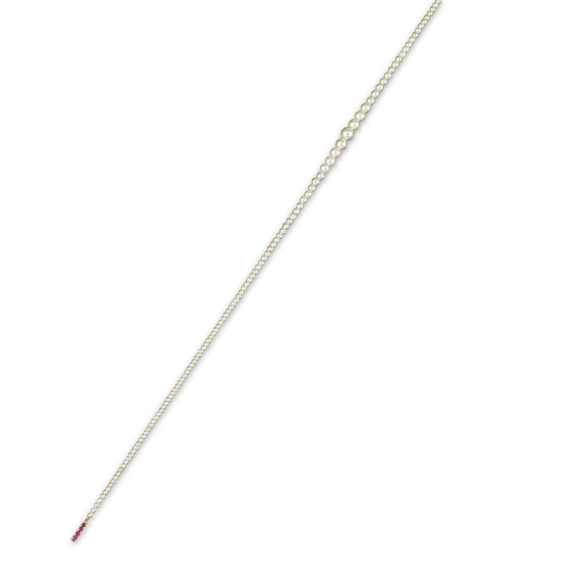 A single row graduated natural pearl necklace, with a gold clasp set with four small rubies. 45cm.
