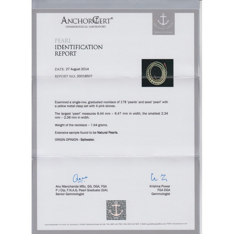 Accompanied by report number 20018507 dated 27th August 2014 from Anchorcert stating that the 178 pearls graduate from 2.34 - 6.47mm, weigh 7.64g in total and are natural saltwater pearls.