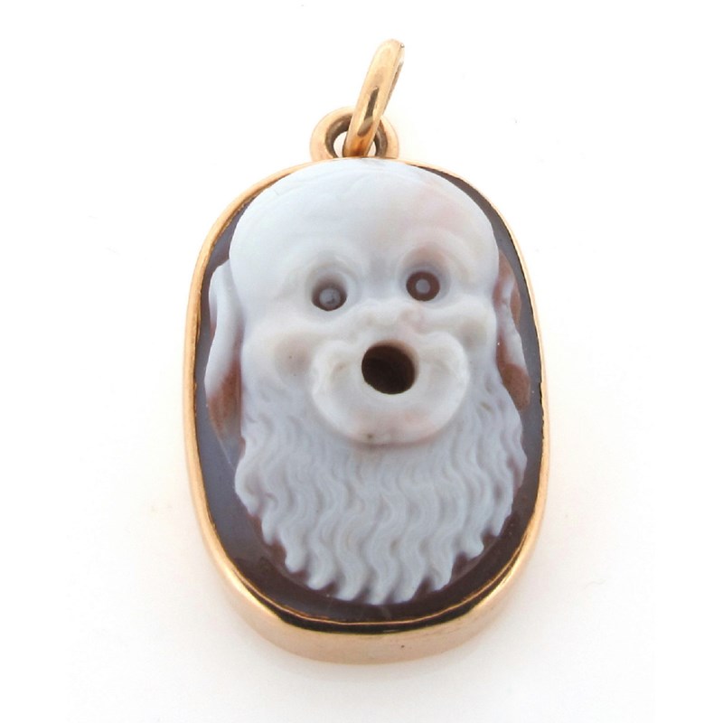 A carved hardstone cameo, depicting a Greek theatre mask after the satire Silenus. Gold mount. 2.2cm high.
