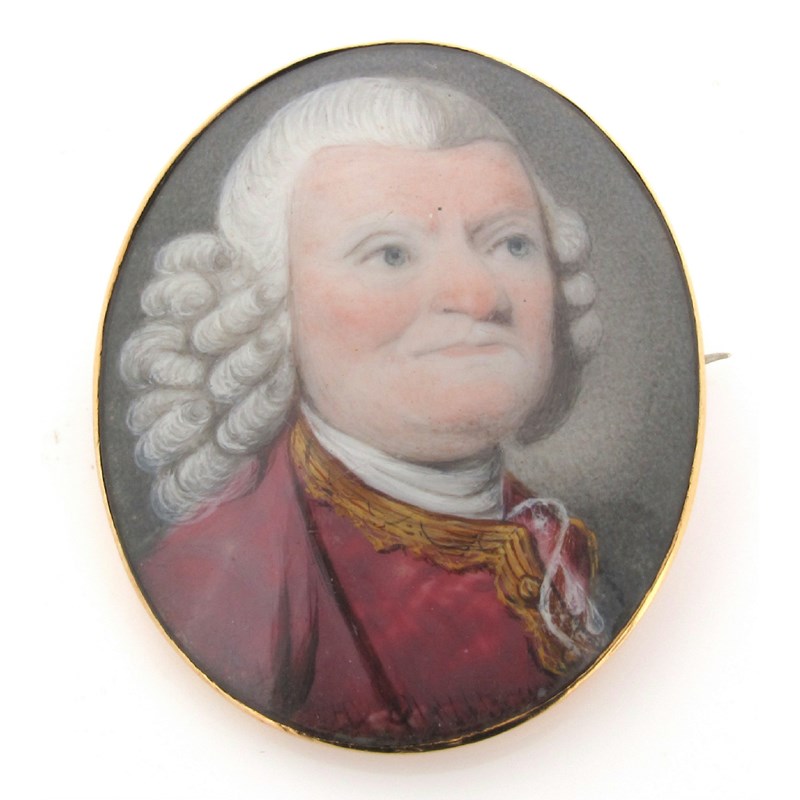 A mid 18th Century oval miniature portrait of a gentleman, wearing an elaborate wig with gold trimmed red clothes and white cravat. 4cm high. Mounted in gold as a brooch.