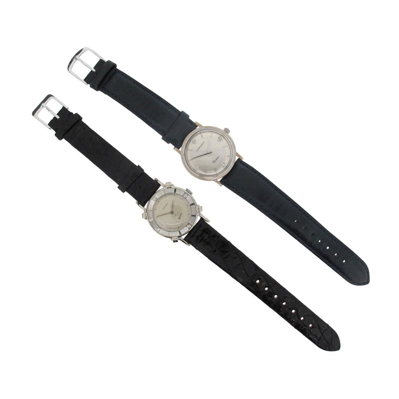 A white gold Cosmo wristwatch by Longines, signed silver dial with diamond markers, automatic movement, leather band, with another Longines wristwatch, the signed dial with subsidiary seconds dial, and baton numerals, diamonds-set to the white gold case, on leather band