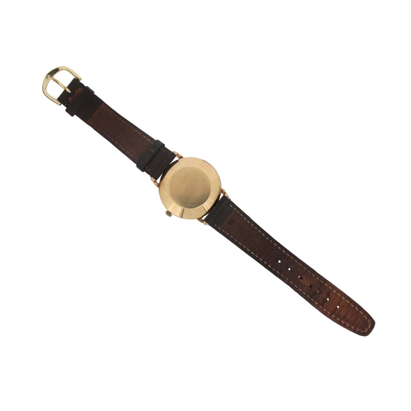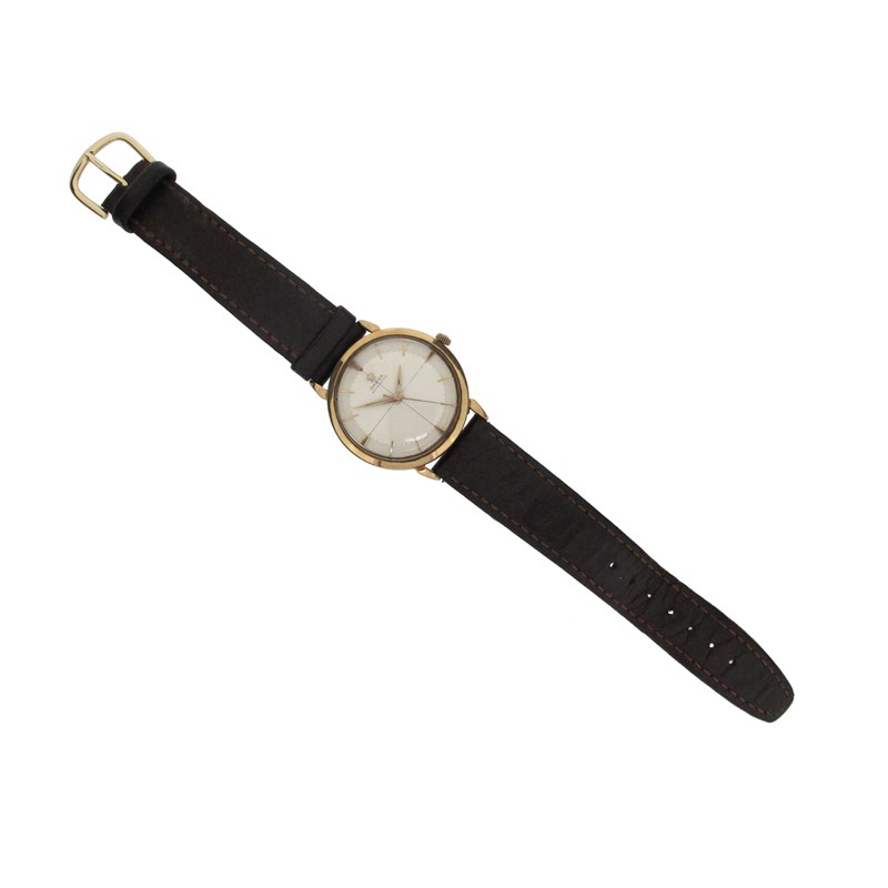 A gentleman's 9ct wrist watch by Omega, silvered cross-hair dial with gold hour markers. Signed automatic calibre 501, numbered 16343829, case back hallmarked Birmingham 1959, serial 962790. Fitted to an unsigned brown leather strap with pin buckle, 34mm
