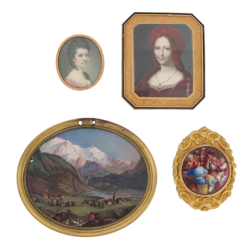 Four portrait miniatures, including an oval miniature portrait of a rural scene, probably Swiss, with a Shepherd and three sheep in the foreground, village buildings in the centre and snow-capped mountains in the distance, in gilt metal frame, 8.5cm wide, an 18th century miniature portrait of a lady with pink dress, probably painted on ivory, a miniature painting of a woman in the Renaissance style wearing a red dress and head dress, painted on ivory, two-colour gold frame with foliate chased border within blue enamel surround, 5.5cm high, a circular miniature painting depicting a scene of revelers in the 18th century style, painted in enamel on porcelain within an ornate gold frame, 3.5cm high
