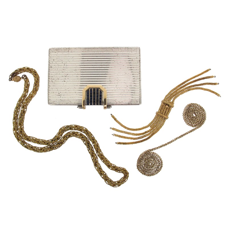Various items of jewellery etc, including an early 19th century section of gold chain with fine pellet decoration, an early 19th century gold clasp with remnants of five chains to each side with fine pellet decoration, a gold-plated fine-link necklace and a continental silver triptych-style travelling hinged looking glass, double-hinged and folding into a single rectangular section with fluted decoration to both sides, set with square-shaped sapphires to the metal clasp