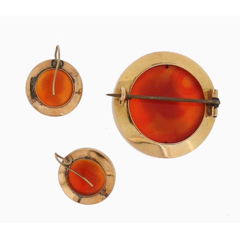 An early 20th century cased brooch and earring set, each circular round piece is set with a circular carved hardstone cameo depicting the profile of a woman, the brooch 3.5cm wide, fitted case