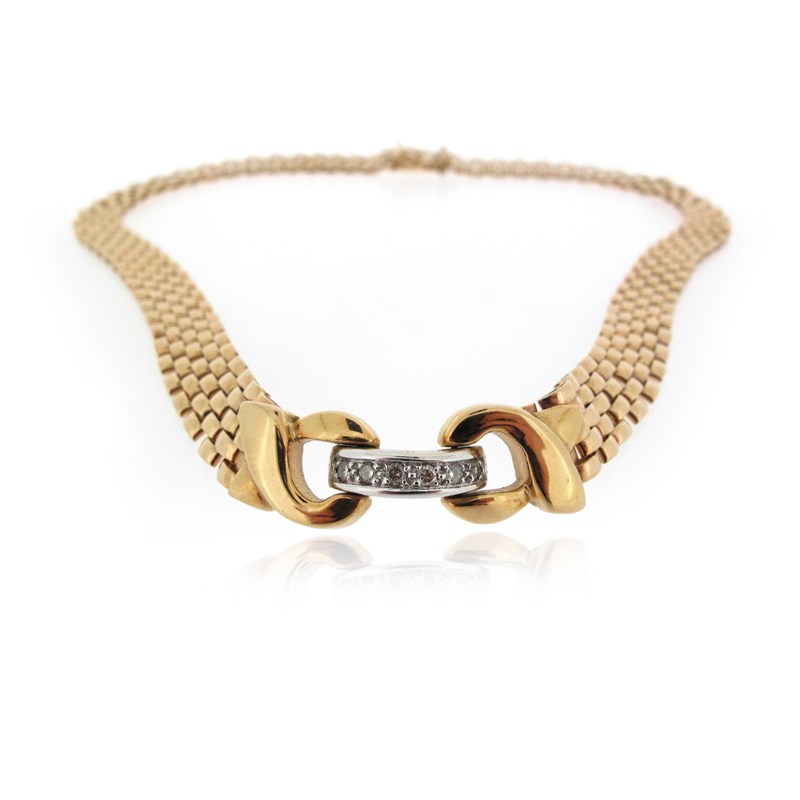 An Italian brick-link collar necklace, the central section set with round brilliant-cut diamonds in yellow and white gold, 42cm long