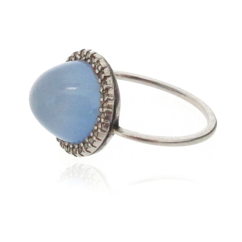 A sugarloaf-shaped chalcedony ring, set within a surround of rose-cut diamonds in white gold, size K