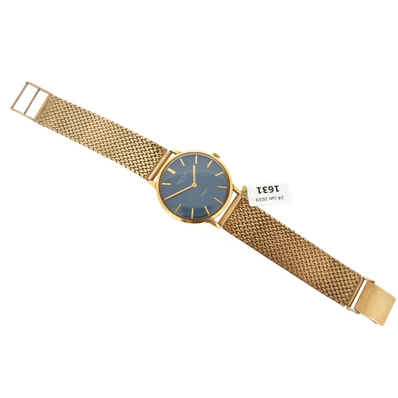 A gentleman's Patek Philippe gold Calatrava wristwatch, the signed blue dial with baton numerals, manual movement, movement number 1220236, reference number 3468, case 3.5cm wide including winder, on an 9ct gold mesh band, in Patek Philippe case and paperwork from 1973