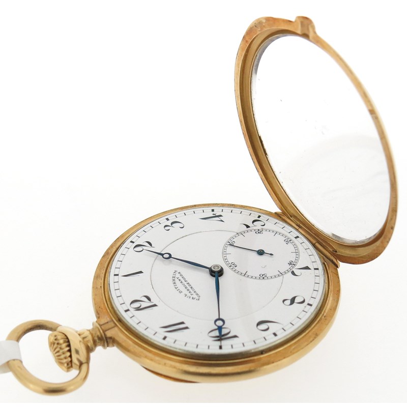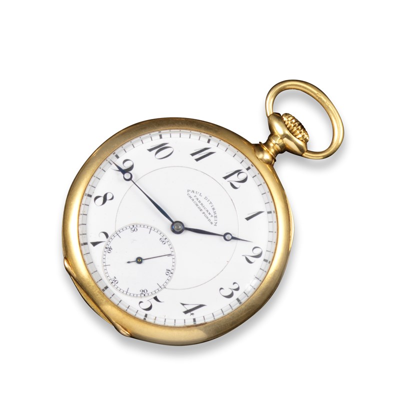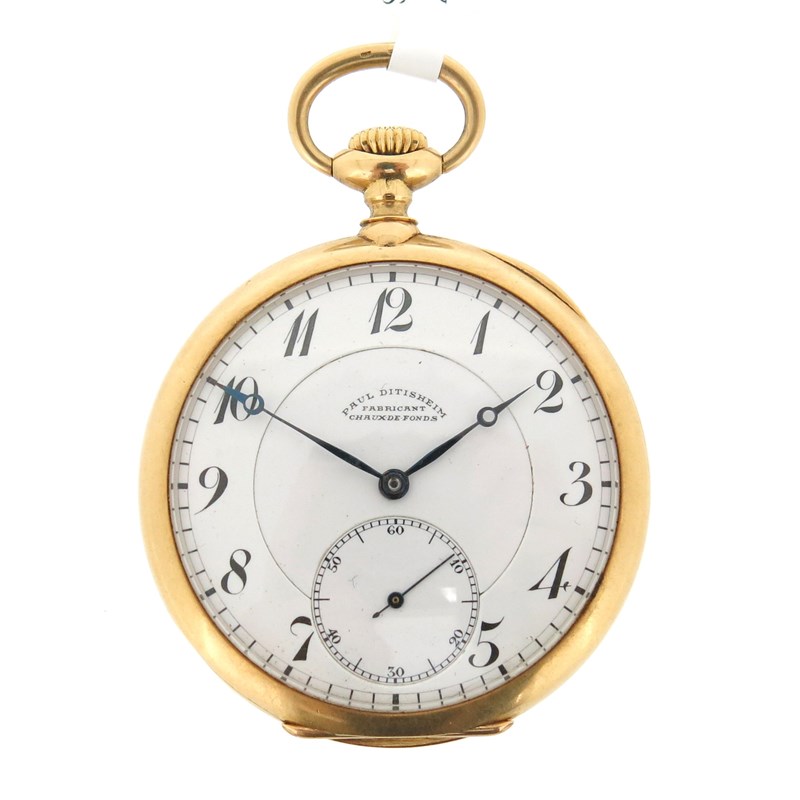 An 18ct gold open faced pocket watch, the white dial signed Paul Ditisheim, with black Arabic numerals and subsidiary seconds dial, Swiss movement, stem-wind, engraved with MC to case back, 5cm wide