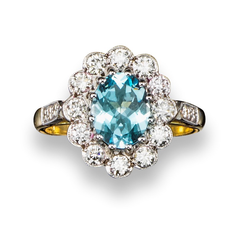 An aquamarine and diamond cluster ring, the oval-shaped aquamarine is set within a surround of twelve round brilliant-cut diamonds in yellow and white gold, with three smaller round brilliant-cut diamonds to each shoulder, size O 1/2
