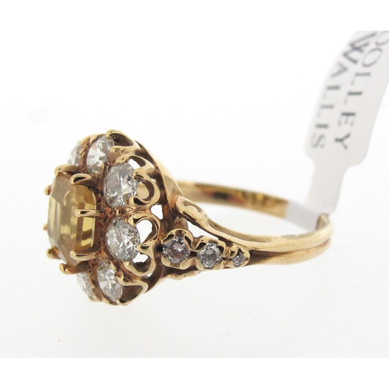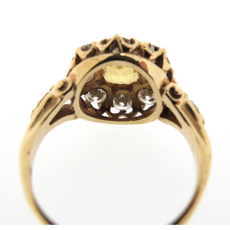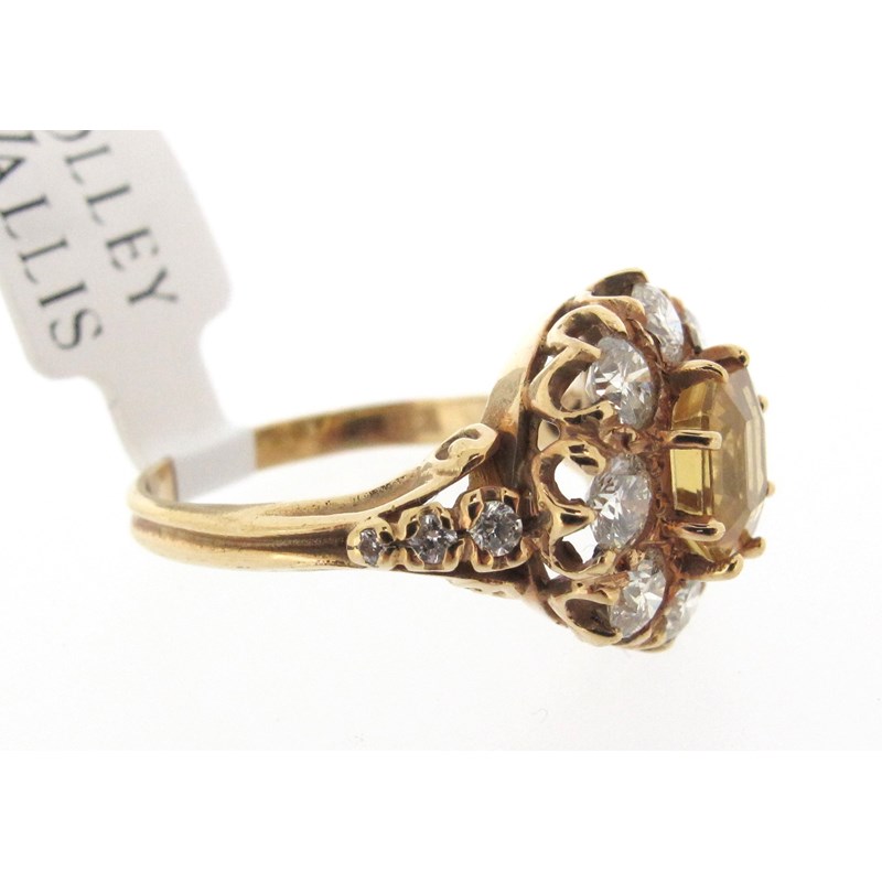 A yellow sapphire and diamond cluster ring, the emerald-cut yellow sapphire set within a surround of eight round brilliant-cut diamonds in yellow gold, with three smaller graduated circular-cut diamonds set to each scrolling shoulder, size O