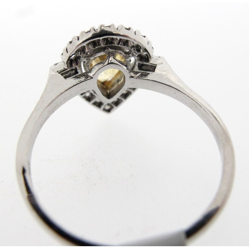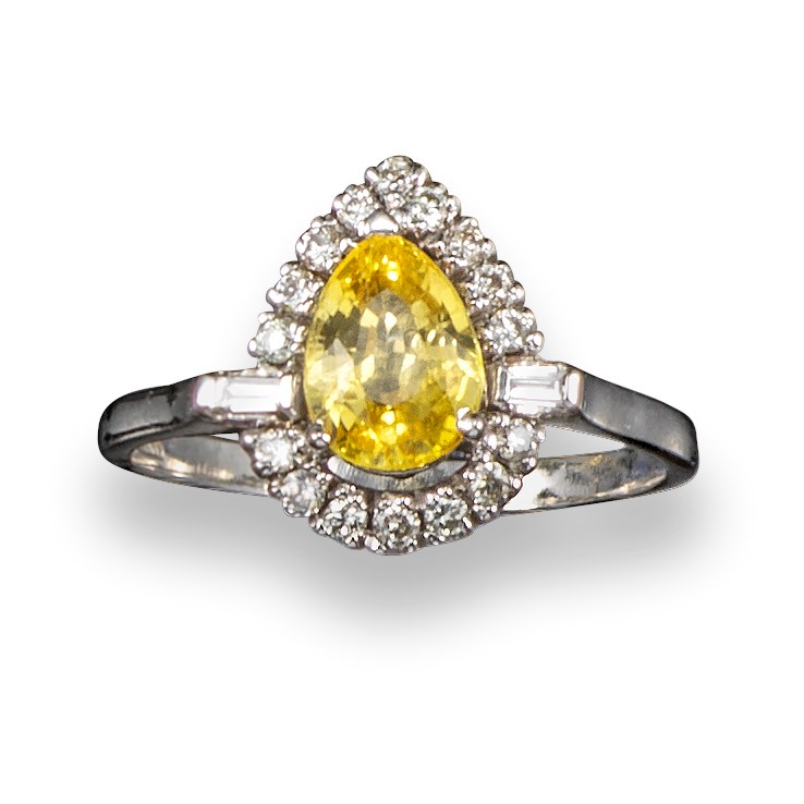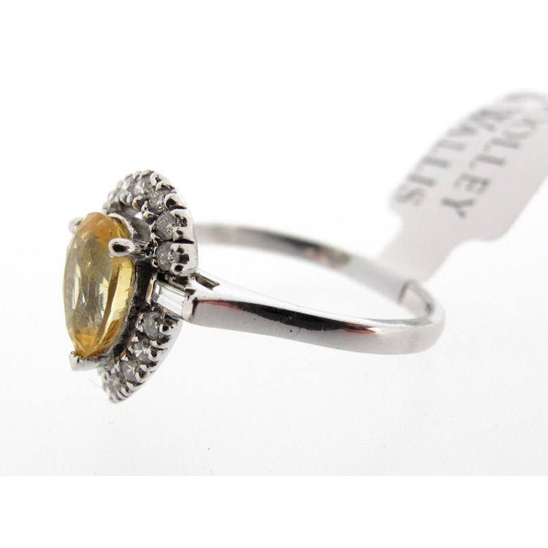 A yellow sapphire and diamond cluster ring, the pear-shaped sapphire set within a surround of round brilliant-cut diamonds and a baguette-shaped diamond to each shoulder in 18ct white gold, London hallmarks for 2014, size M 1/2