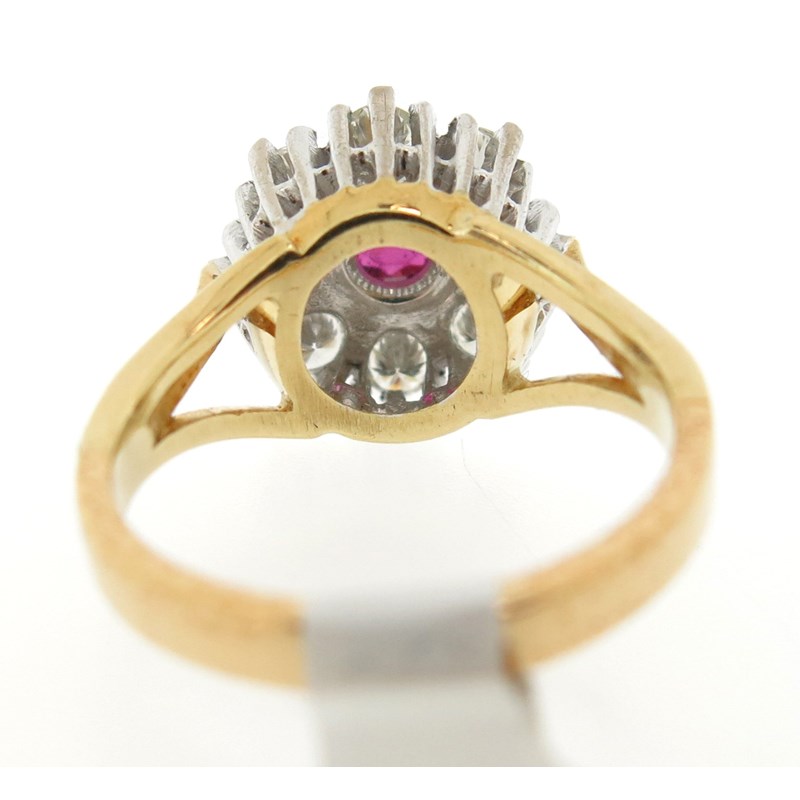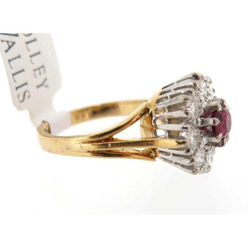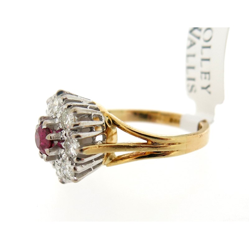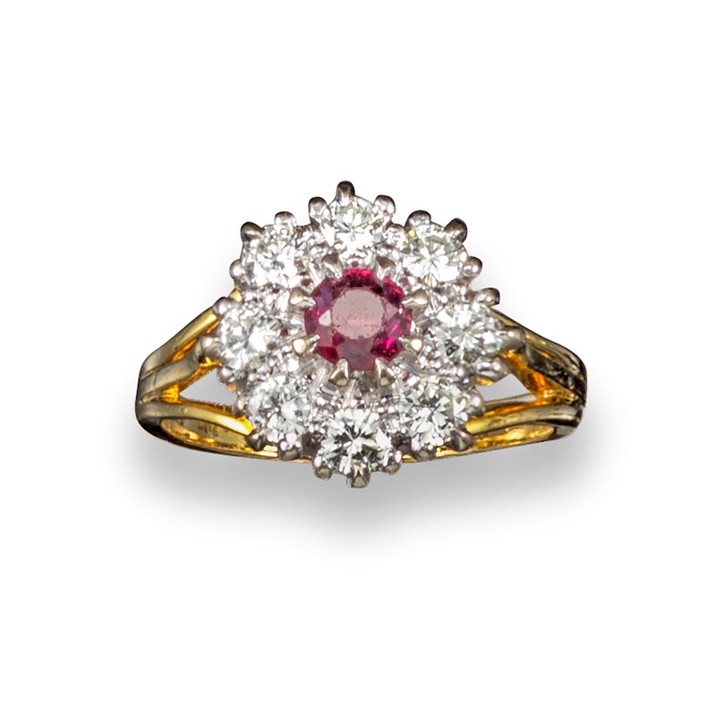 A ruby and diamond cluster ring, the circular-cut ruby set within a surround of eight circular-cut diamonds in platinum and 18ct yellow gold, size M, case