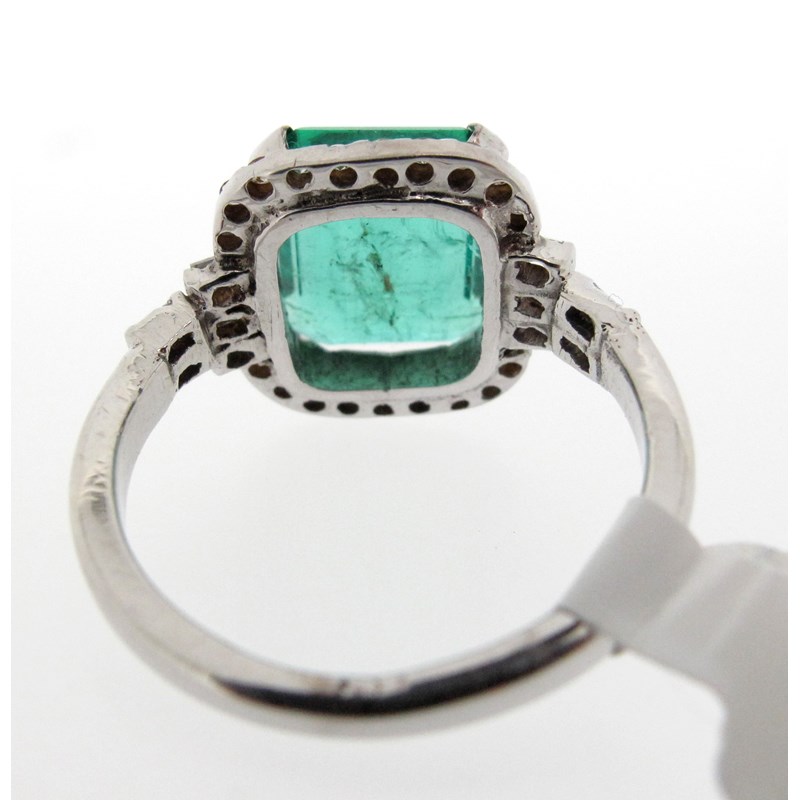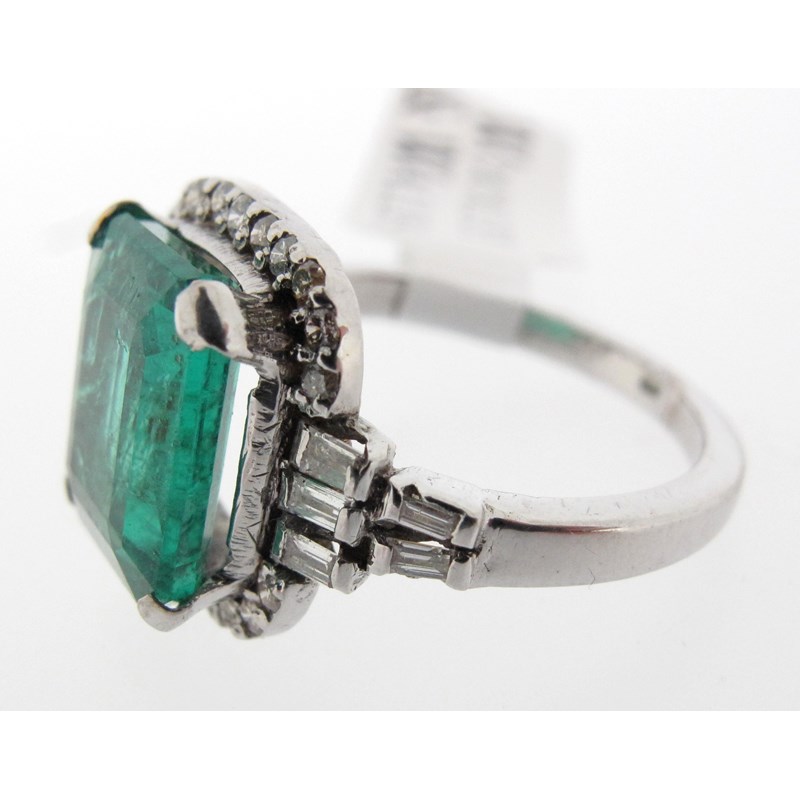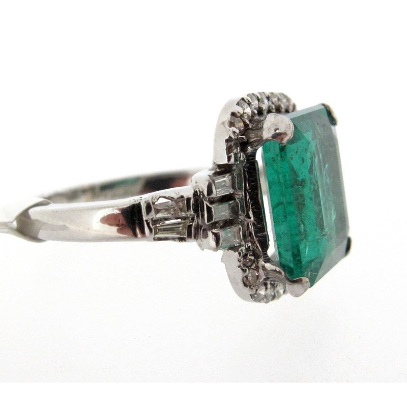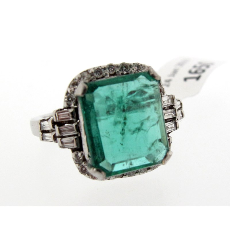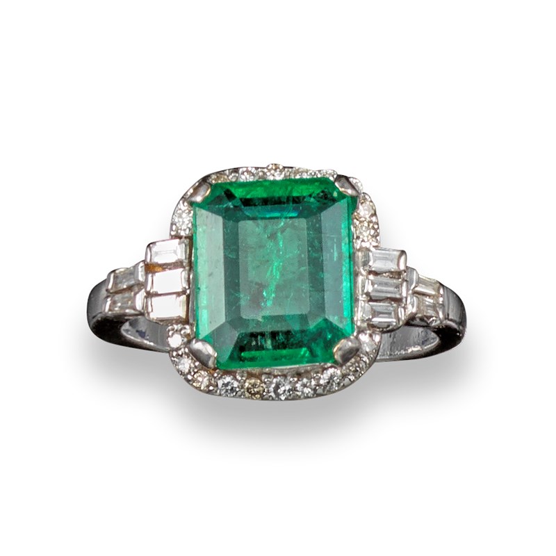 An emerald and diamond cluster ring, the emerald-cut emerald is set within a surround of baguette-shaped and circular-cut diamonds in white gold, size O