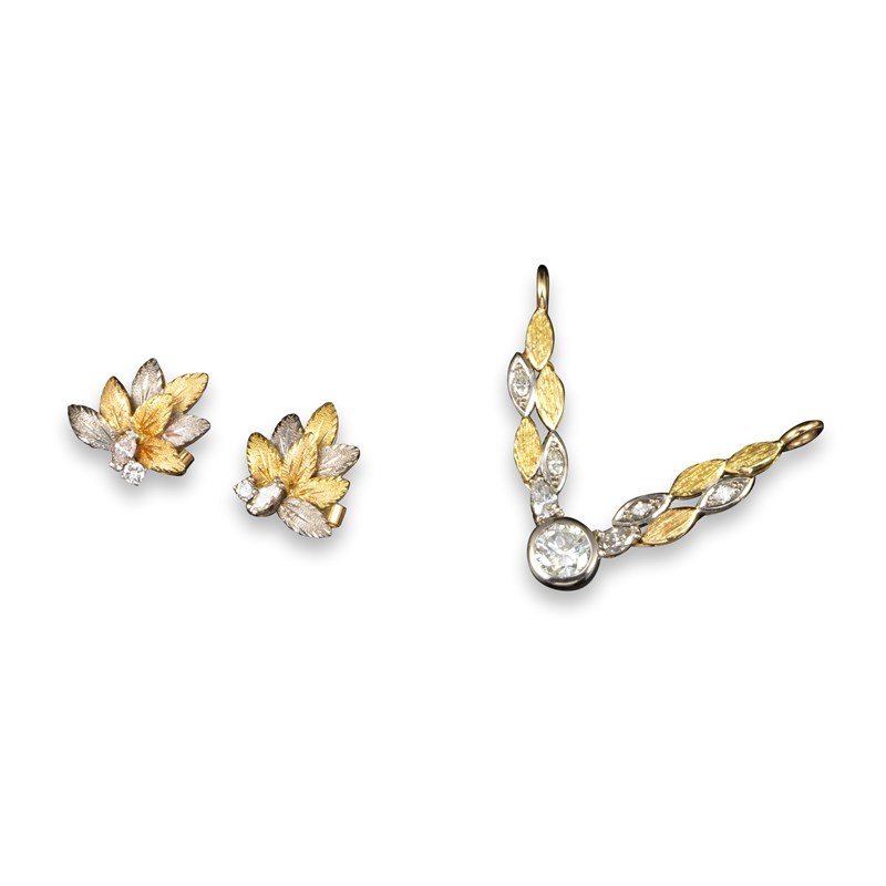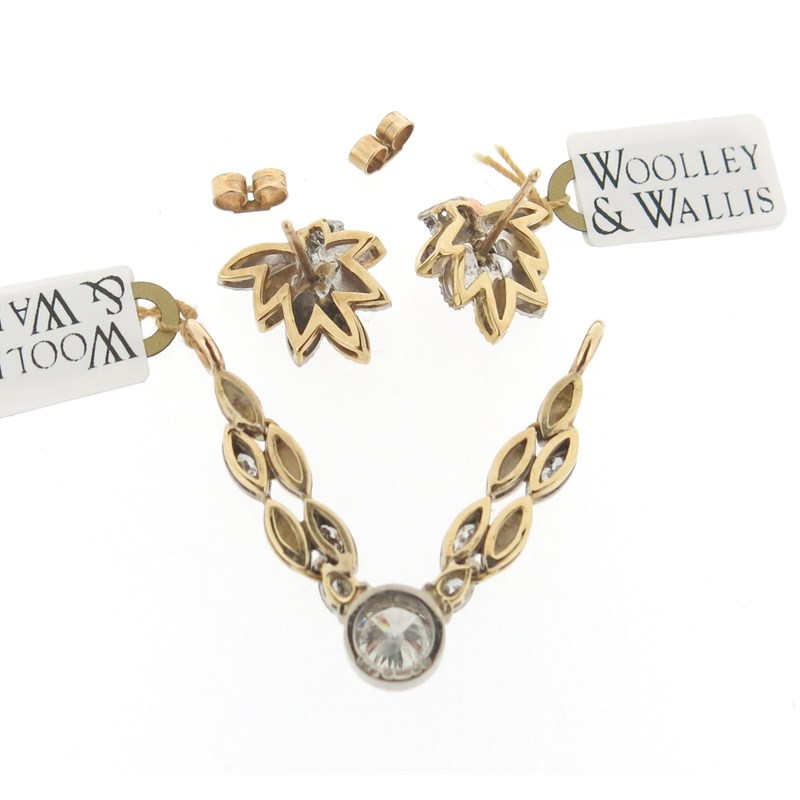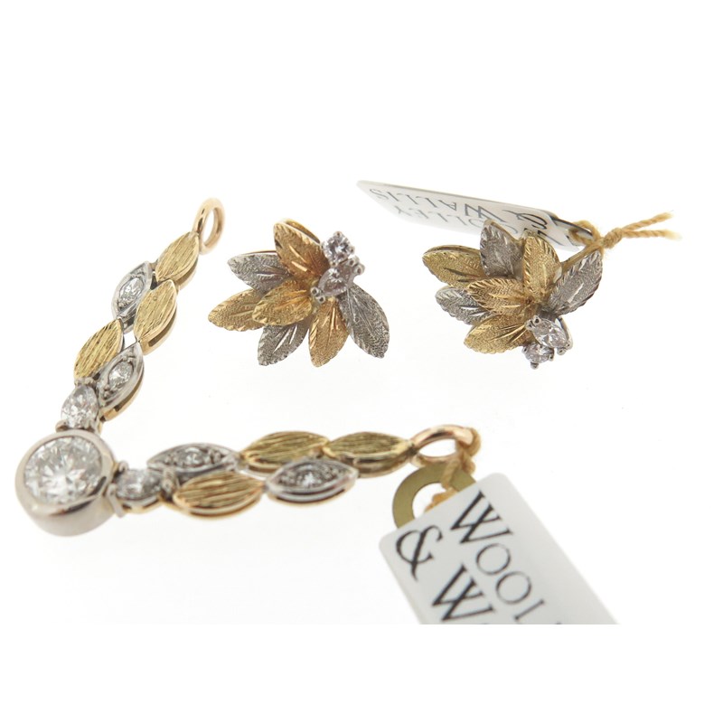 A diamond pendant and matching earrings, the principal round brilliant-cut diamond weighs approximately 0.65cts, suspended from pear-shaped diamonds and alternately-set textured yellow gold and diamond-set white gold links, maker MB and London hallmarks for 9ct, 2003, with a pair of textured leaf and diamond-set 9ct gold ear studs, 15mm long
