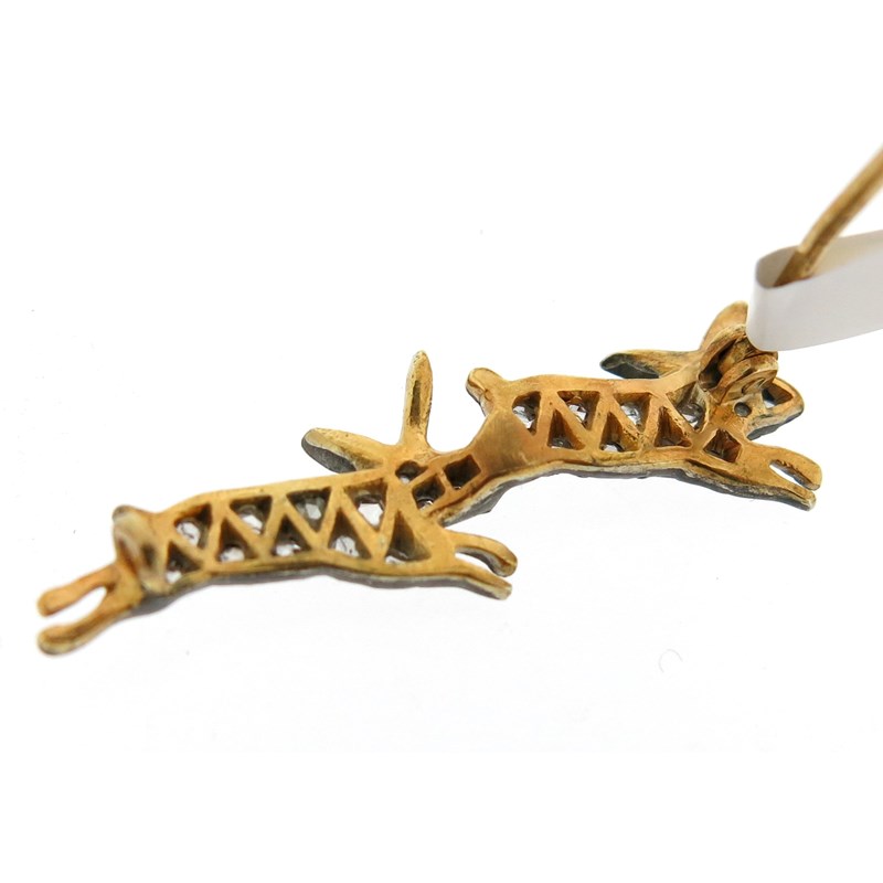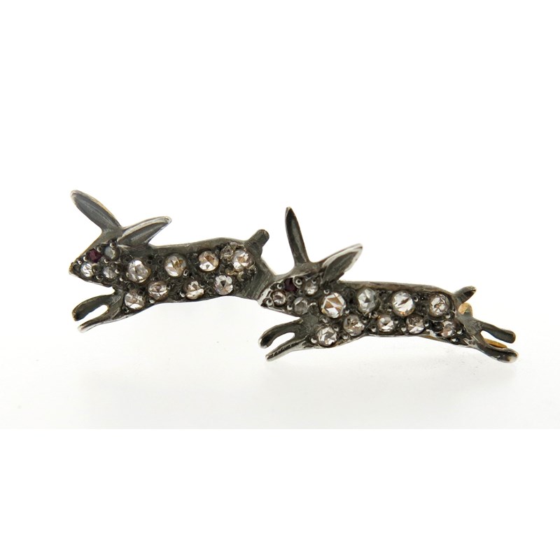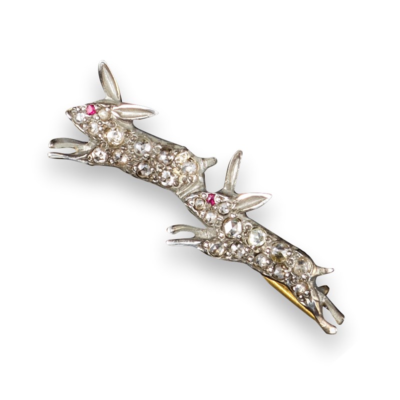 A ruby and diamond running rabbit brooch, each rabbit set with rose-cut diamonds and a ruby eye in silver and gold