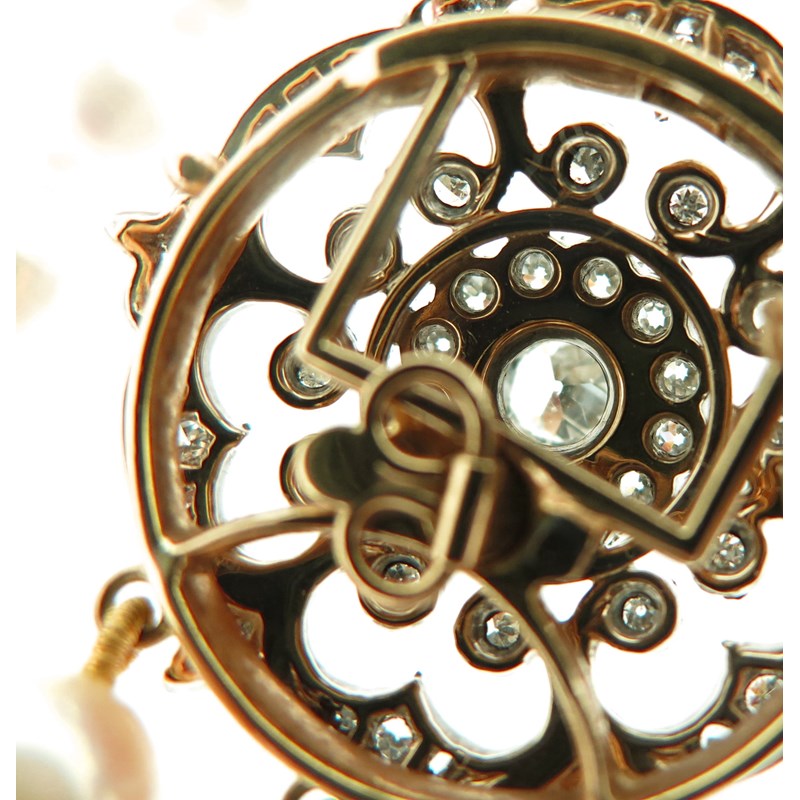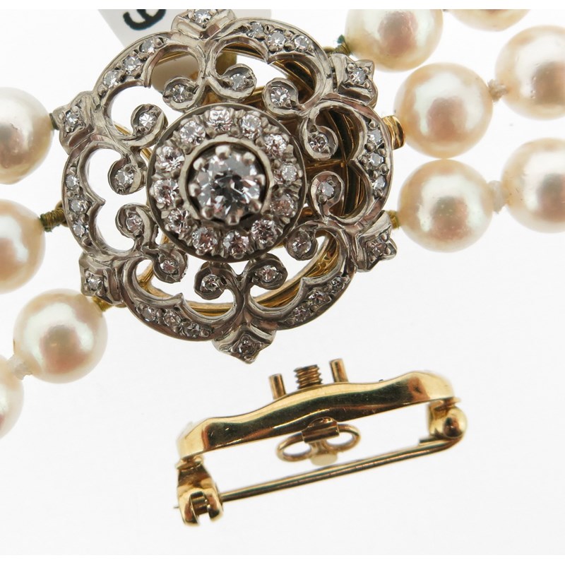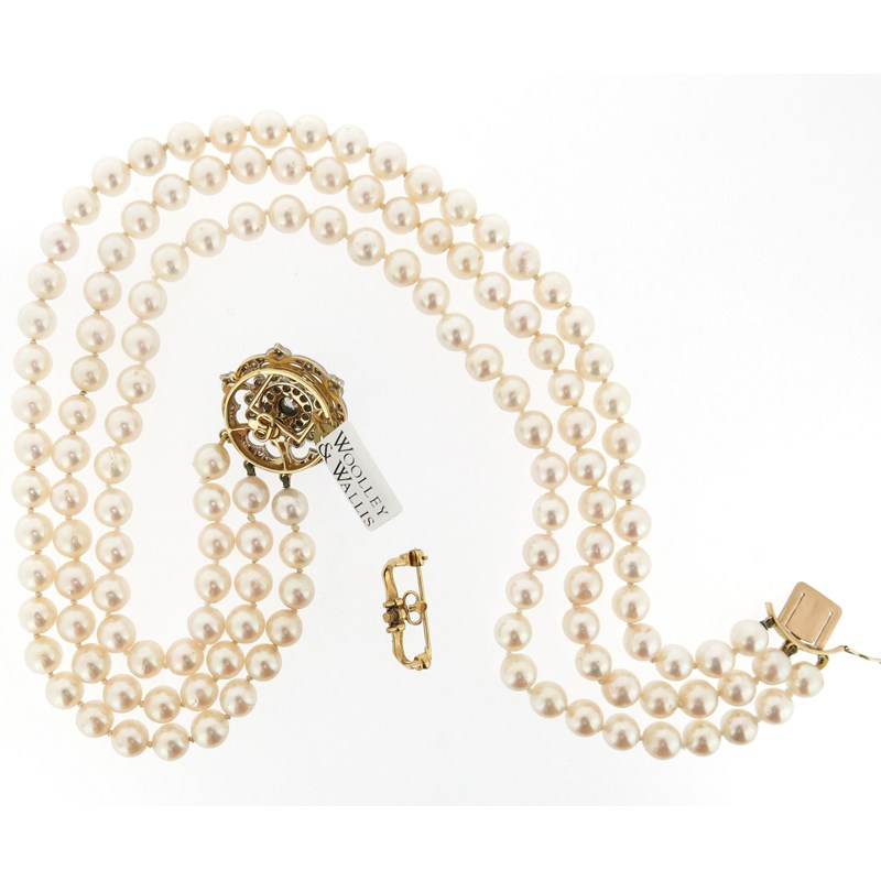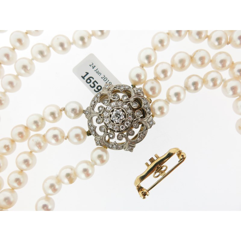 A three row cultured pearl necklace, set with a detachable Victorian diamond cluster clasp in silver and gold, the necklace 41cm longest, clasp 2.8cm wide