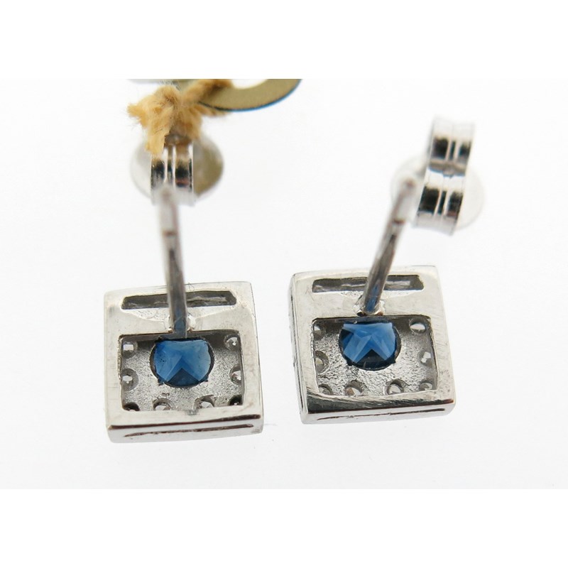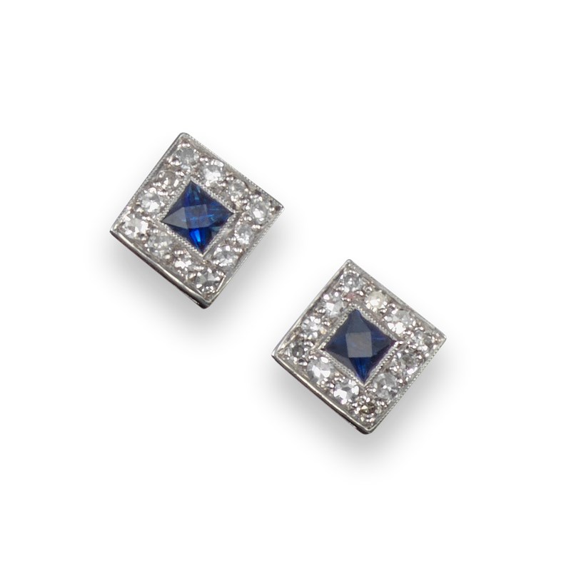 A pair of sapphire and diamond cluster earrings, the square-shaped sapphires are set within a surround of single-cut diamonds within square-shaped white gold mounts, post fittings, each 0.7cm wide