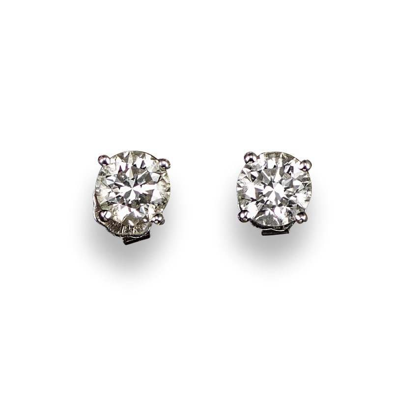 A pair of diamond stud earrings, the round brilliant-cut diamonds each weigh approximately 0.75cts and are claw set in platinum, with London platinum hallmarks for 2010, post fittings