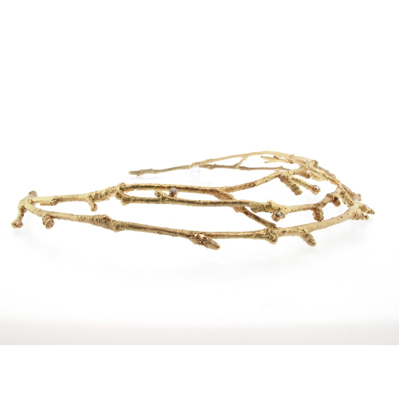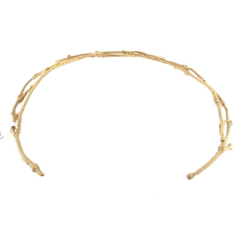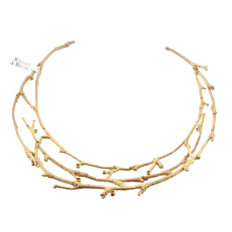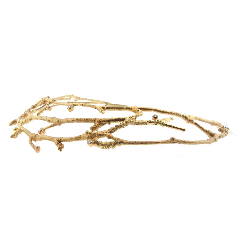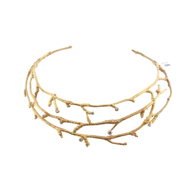 A yellow gold branch-form torque necklet, set with graduated round brilliant-cut diamonds, marked SHAW, 13cm internal diameter, 58g