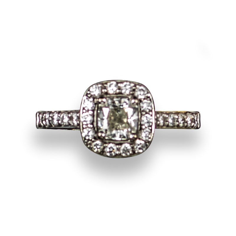 A diamond cluster ring, the central cushion-shaped diamond weighs 0.70cts and is set within a surround of circular-cut diamonds and diamond-set shoulders in white gold, with laser inscription to the girdle corresponding to the GIA certificate, size M 1/2, case