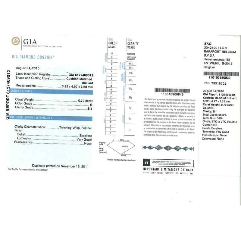 Accompanied by report number 6127409012 from GIA stating that the diamond weighs 0.70cts, with G colour, SI1 clarity,