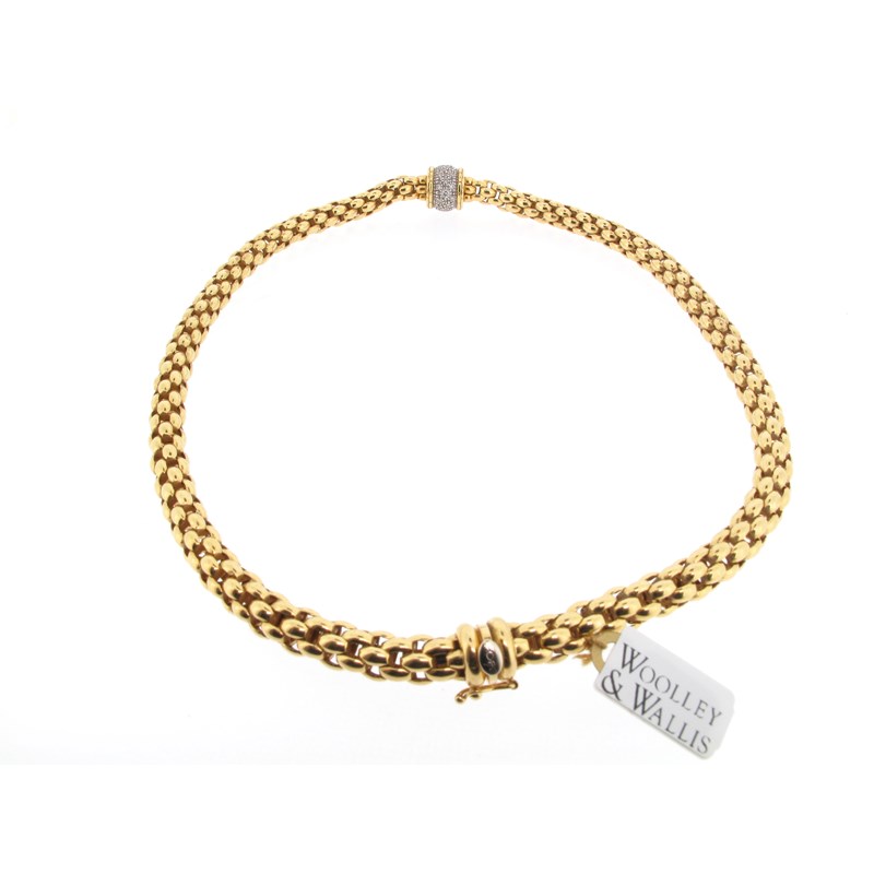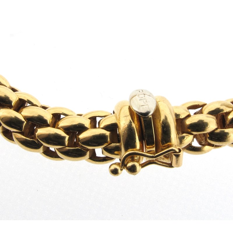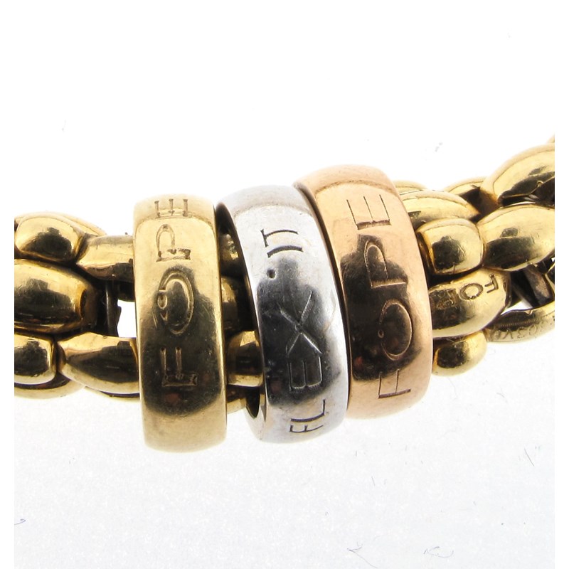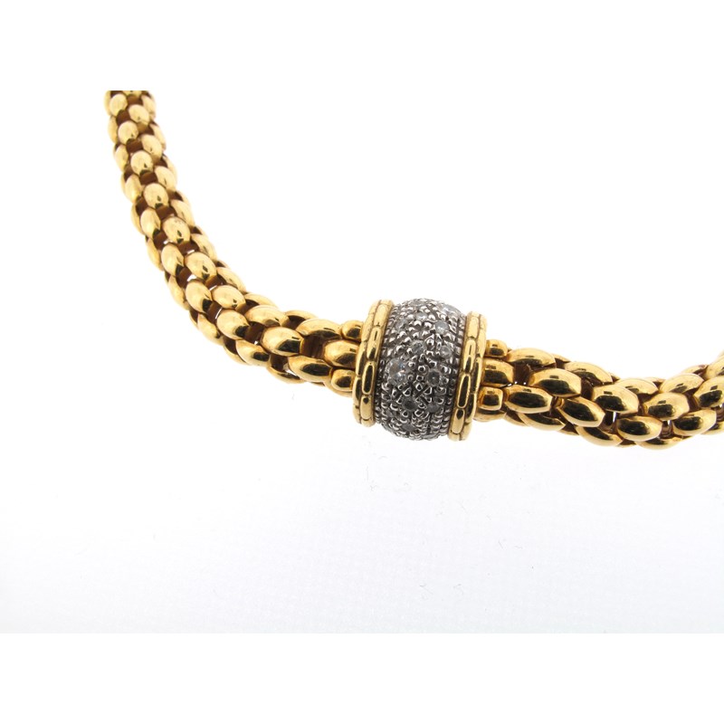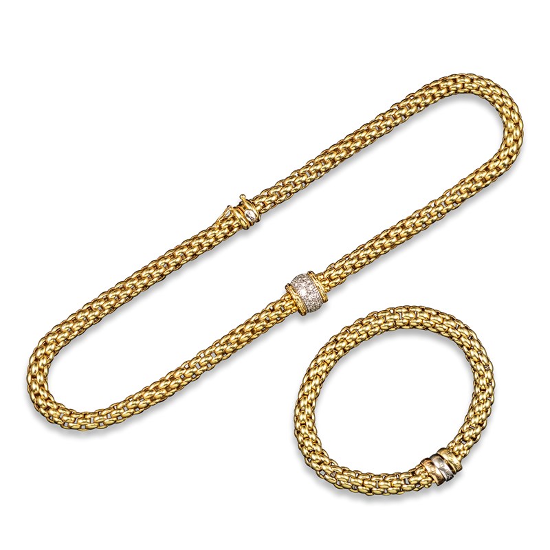 An Italian fancy-link three-colour gold necklace and expanding bracelet by FOPE, the necklace with a yellow and white gold cylindrical centre-section pave-set with graduated circular-cut diamonds, the bracelet with a yellow, white and rose-gold circular link, each stamped 'FOPE, FLEX. IT', necklace 42.5cm long