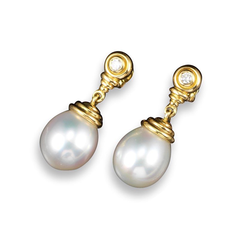 A pair of cultured pearl and diamond drop earrings, each round brilliant-cut diamond is set in yellow gold rubover setting suspending a white cultured pearl, post fittings, stamped 750, 3cm long