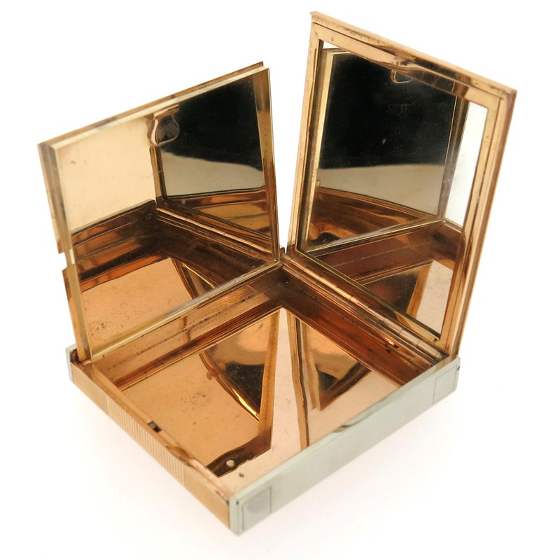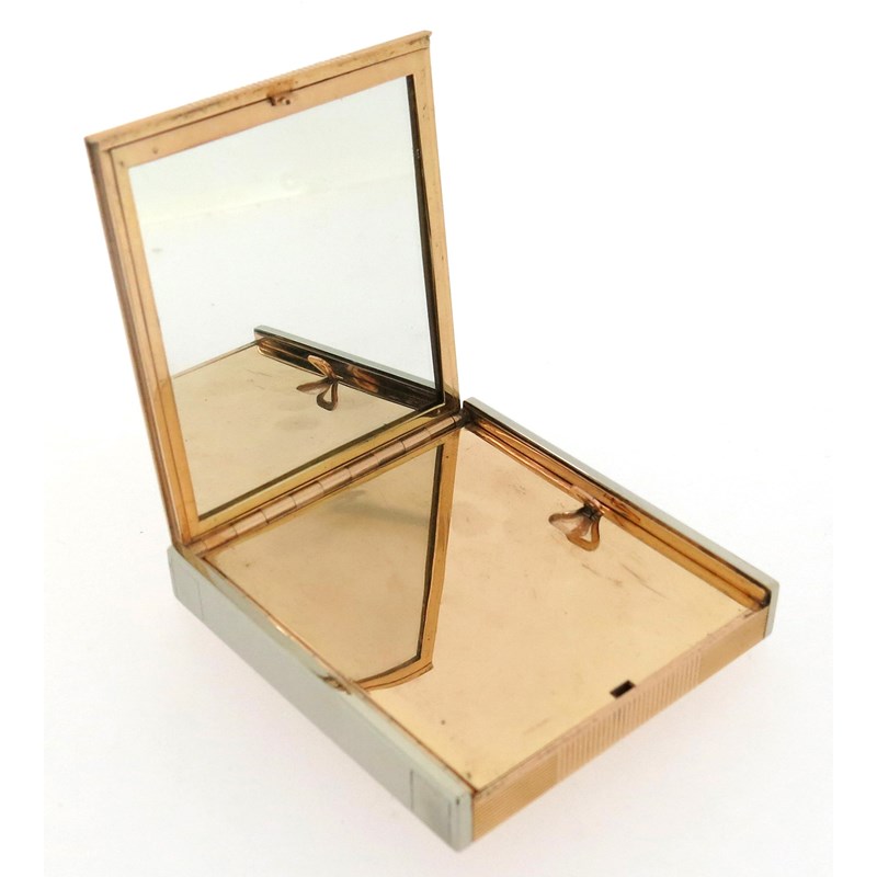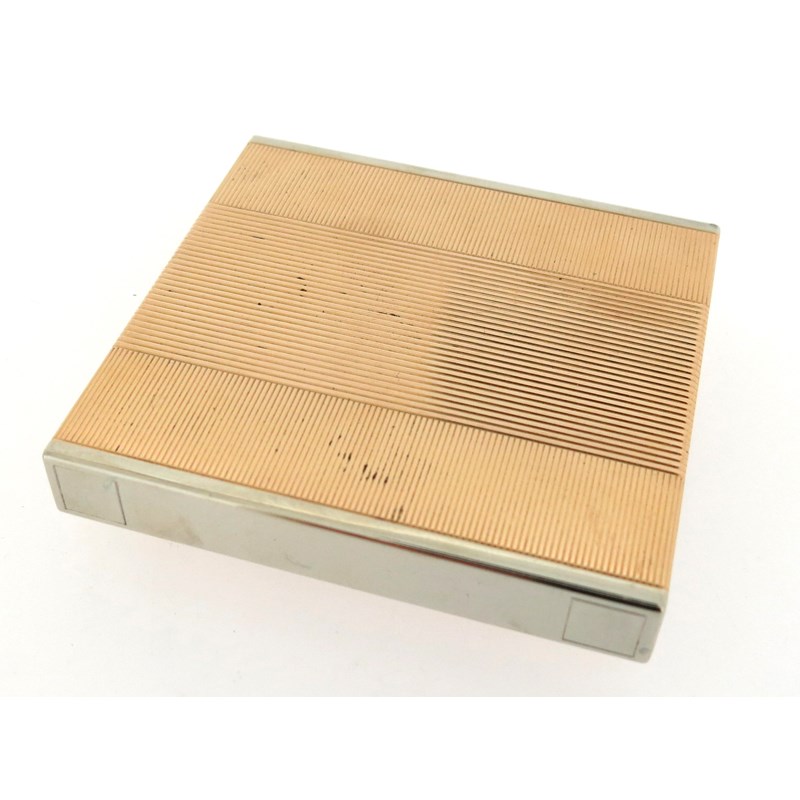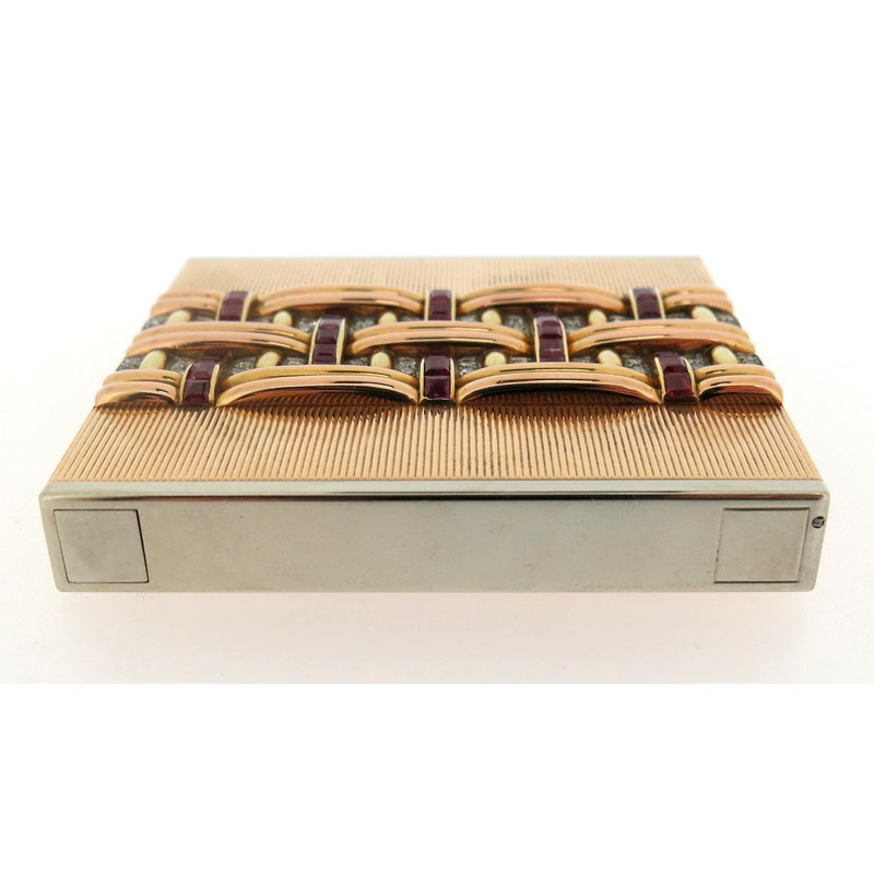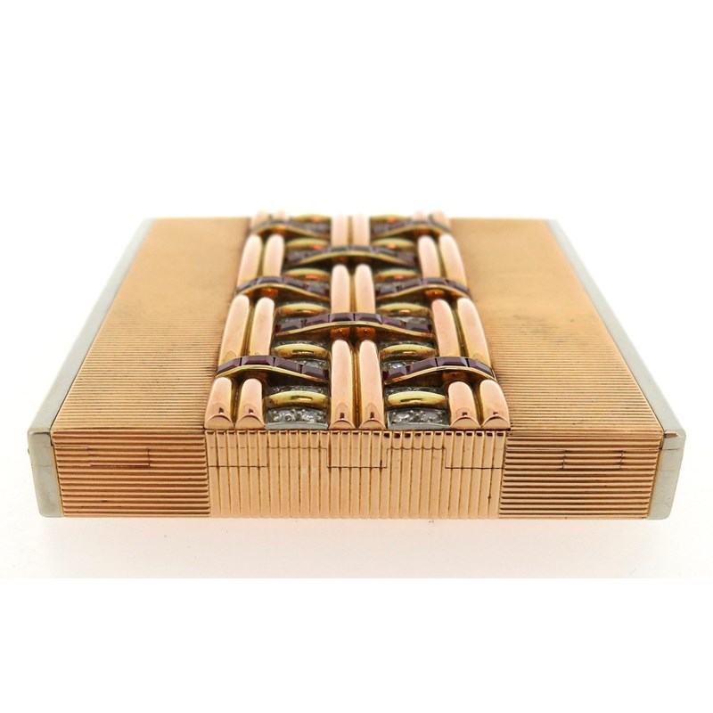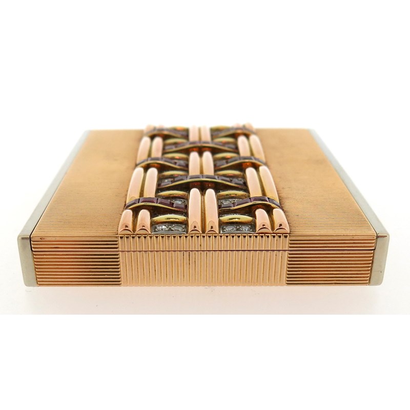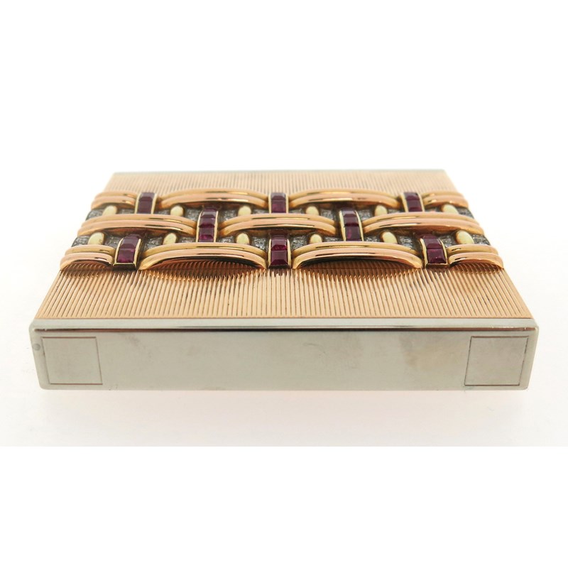 A French ruby and diamond compact, decorated with interwoven lines of rubies, diamonds and gold on engine-turned ground, hinged opening to reveal a mirror and inner compartment, French control marks and maker's lozenge ZL, 7cm long, 160g