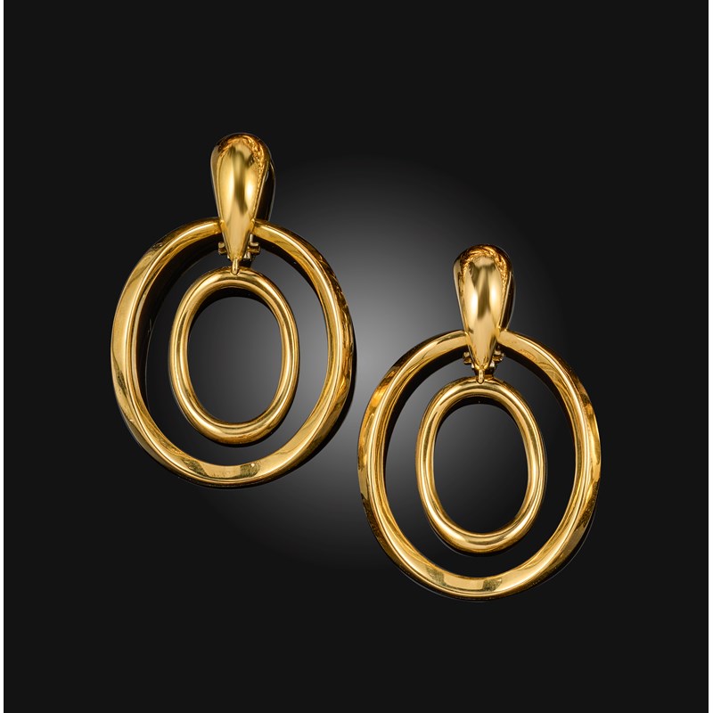 A pair of gold earrings, each composed of two concentric hoops suspended from a bombé bail, in