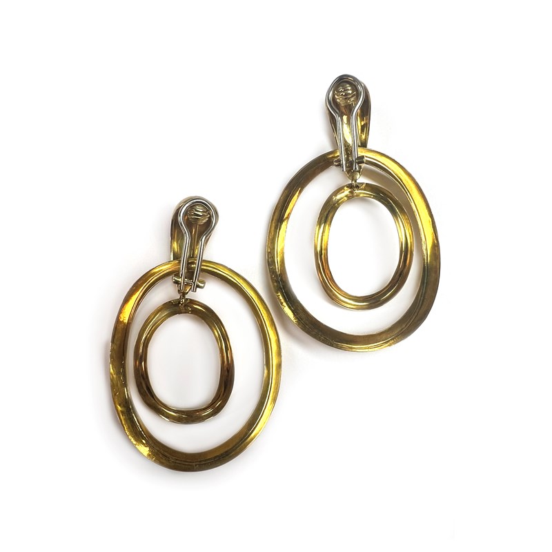 A pair of gold earrings, each composed of two concentric hoops suspended from a bombé bail, in polished gold, length 6.8cm, clip and post fittings, Italian maker's marks, stamped 750, case stamped Puiforcat