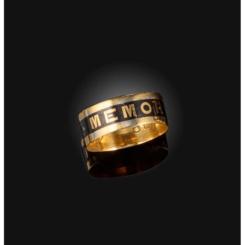 A late 19th century enamel mourning ring, decorated with black enamel and the words In Memory Of,