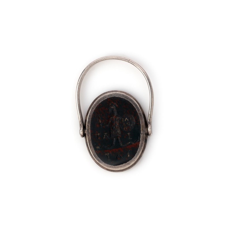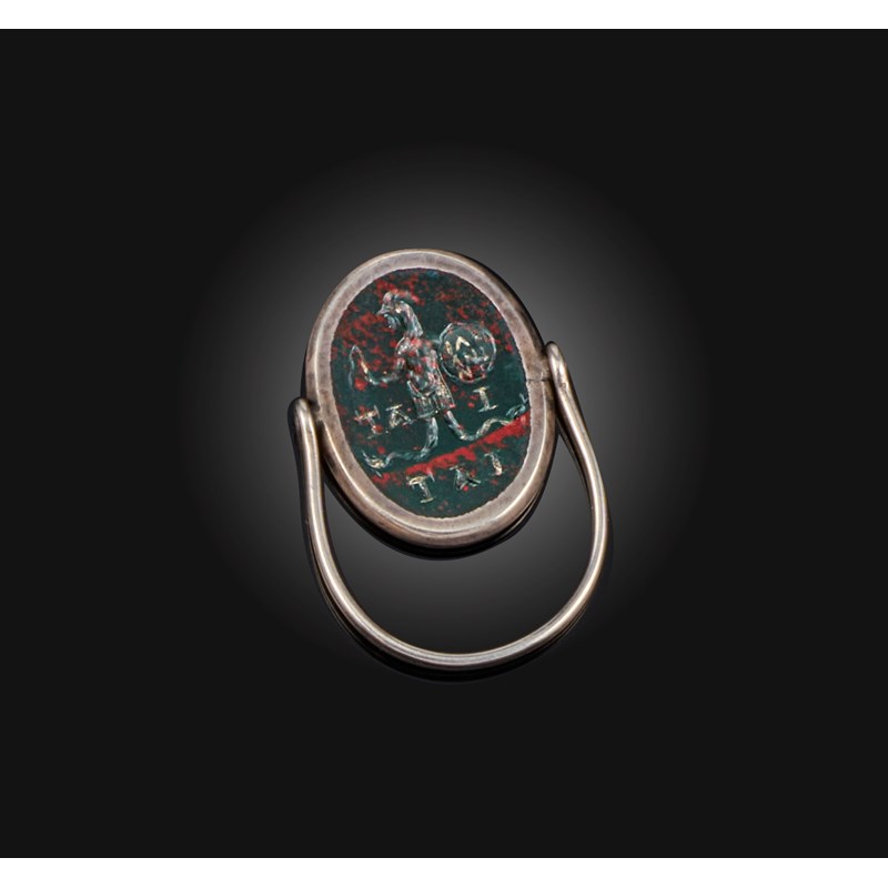 A fine and rare bloodstone magical gem, Greco-Roman, 2nd-3rd century AD, the two-sided bloodstone intaglio of oval outline, carved on one side to depict a crowned sun god bordered with Greek script, the other side depicting the cockerel-headed god Abrasax/Abraxas, with snake legs, holding a shield and whip his shield with an inscription, the background inscribed TAI TAI, to a later swivel mount on a half hoop ring, intaglio 1.7 x 1.4cm