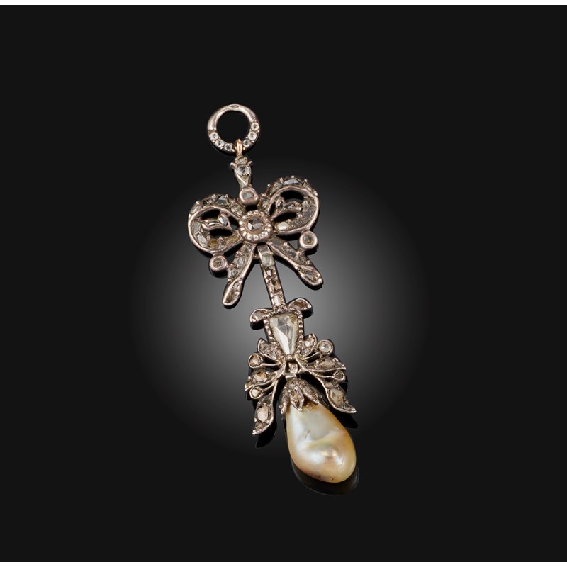 A natural pearl and diamond pendant, 18th century, designed as a ribbon bow suspending a foliate