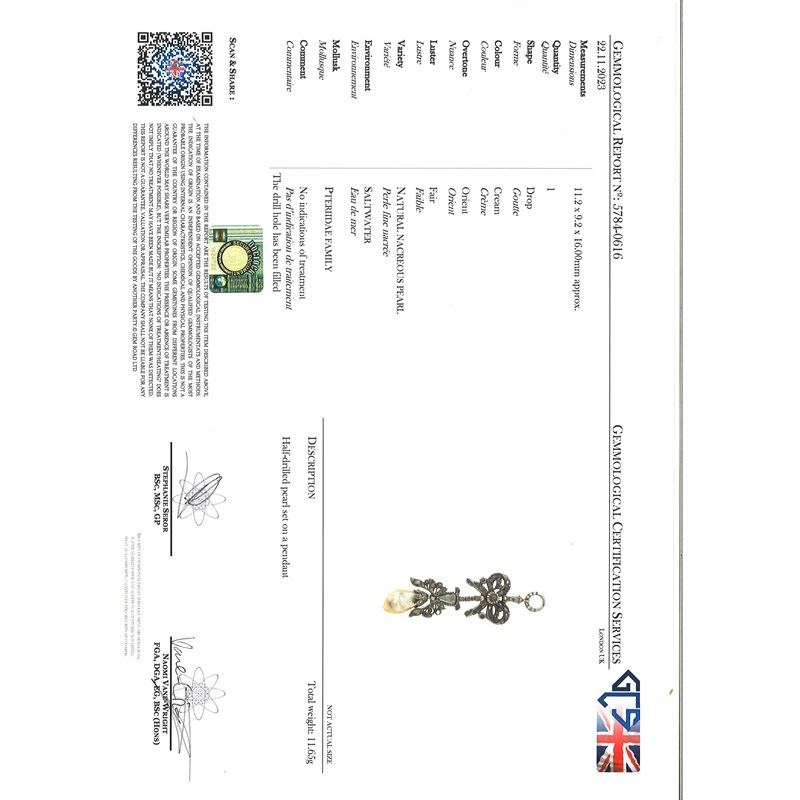 Accompanied by GCS report no. 5784-0616, stating that the pearl is natural, saltwater