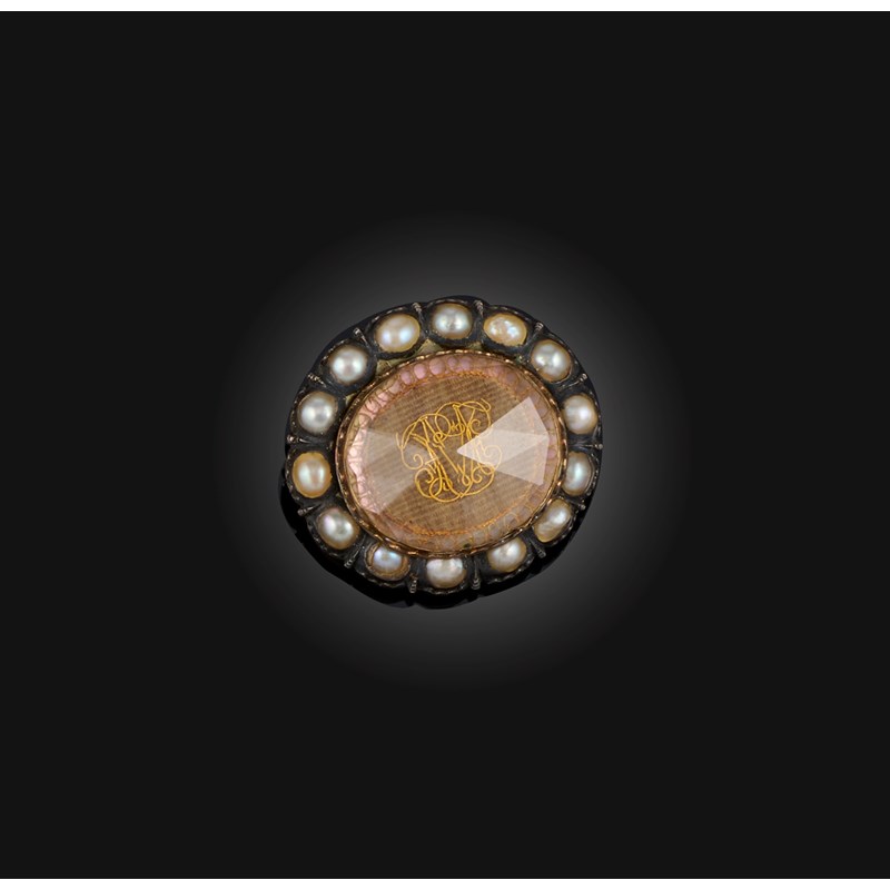 A Stuart crystal, pearl and enamel memorial ribbon slide, second half 17th century, centred with gold wirework initials on a plaited hair ground beneath rose cut rock crystal, within an outer border of pearls, surround of pearls, the reverse applied with black, white and pink enamel with a dedicatory inscription reading 'M.F Desember y.25 1655', length 2.6cm, pearls untested, case