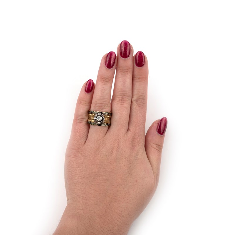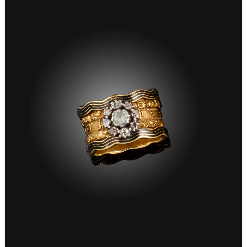 A William IV enamel, rock crystal and diamond mourning ring, circa 1835, centring on a rose-cut rock crystal within a border of cushion-shaped diamonds, to a wide gold band reading IN MEMORY OF' within floral borders and outer undulating bands of black enamel, size O, British hallmarks for 18ct gold, date letter for 1835, central rock crystal likely a replacement