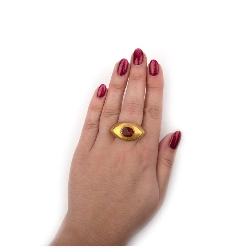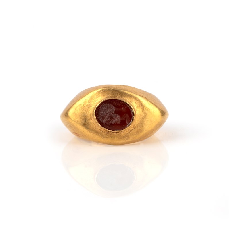 A Roman carnelian intaglio ring, 3rd century AD, set with an oval carnelian intaglio depicting a