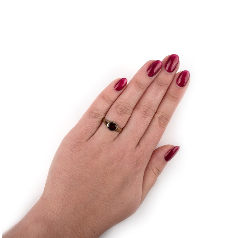 A garnet ring, circa 1695, centring on a shallow oval garnet in a foil-backed setting, to a plain
