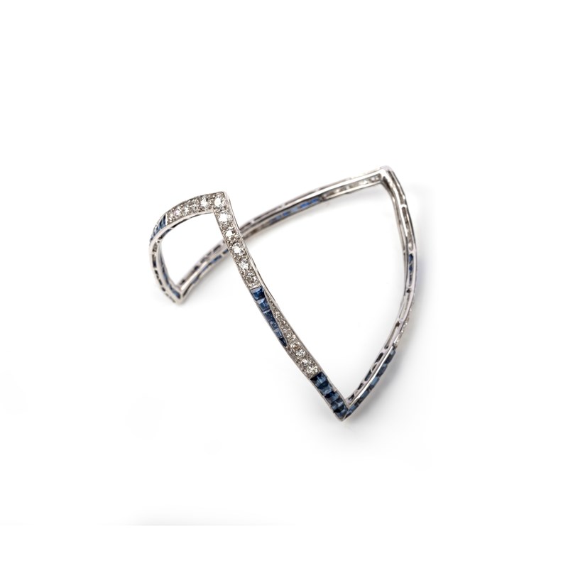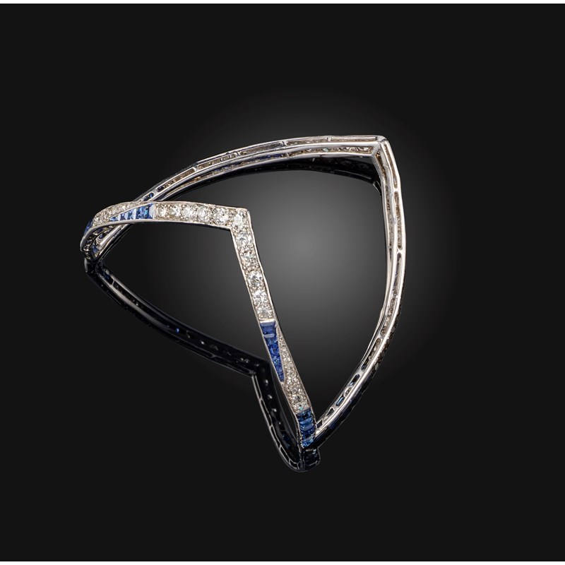 An early 20th century sapphire and diamond bangle, the stylised V-shaped bangle millegrain-set with circular-cut diamonds and calibré-cut sapphires in a geometric pattern, set in platinum, internal width 5.7cm, in case marked Linden & Co