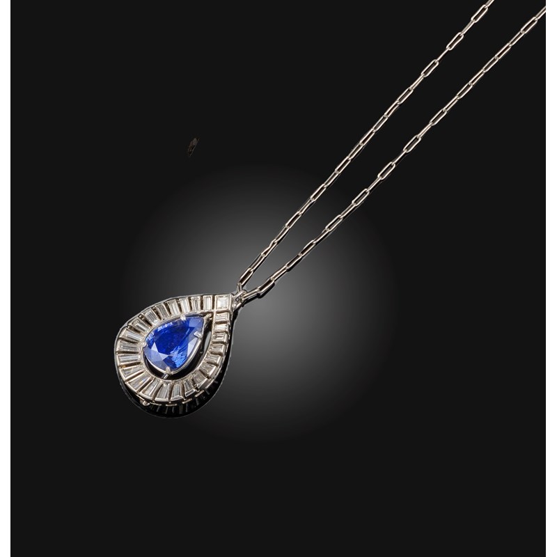 A sapphire and diamond pendant, the pear-shaped sapphire suspends within a border of baguette-shaped