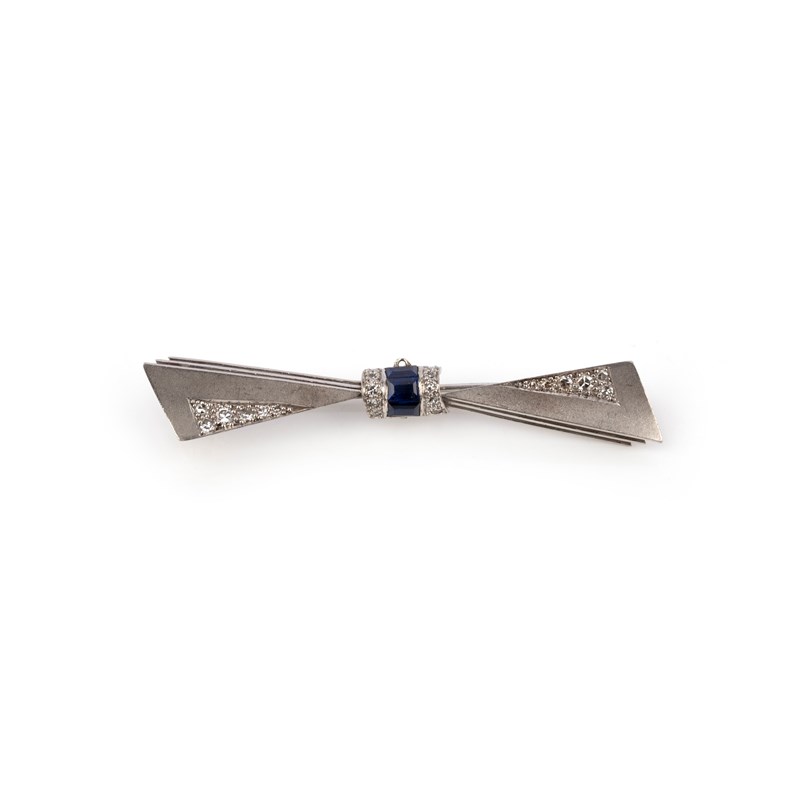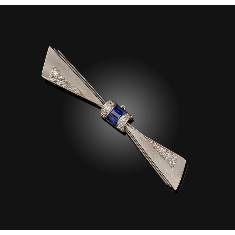 An Art Deco sapphire and diamond brooch, 1930s, designed as a stylised bow in matte platinum, set