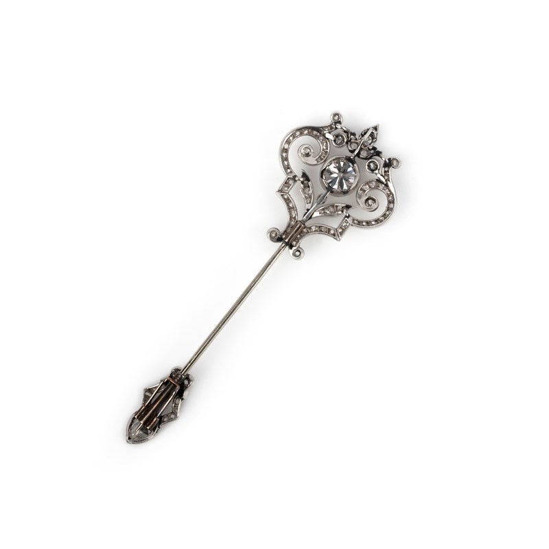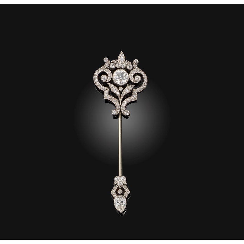 An early 20th century diamond-set jabot pin, of openwork scrolling design set overall with graduated