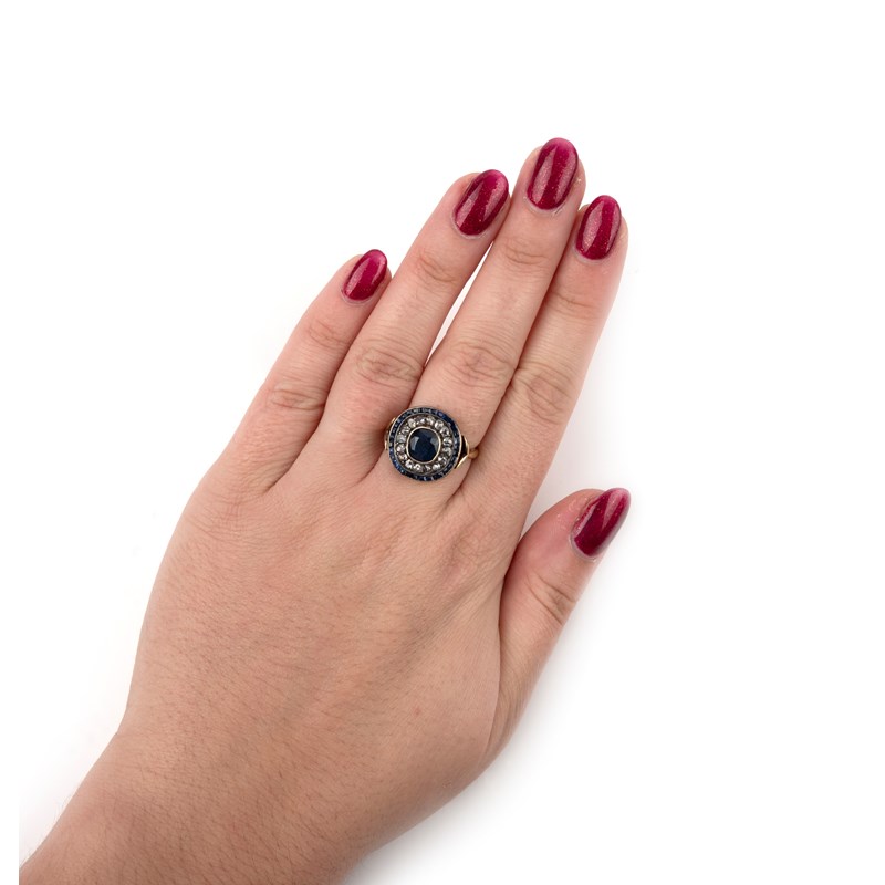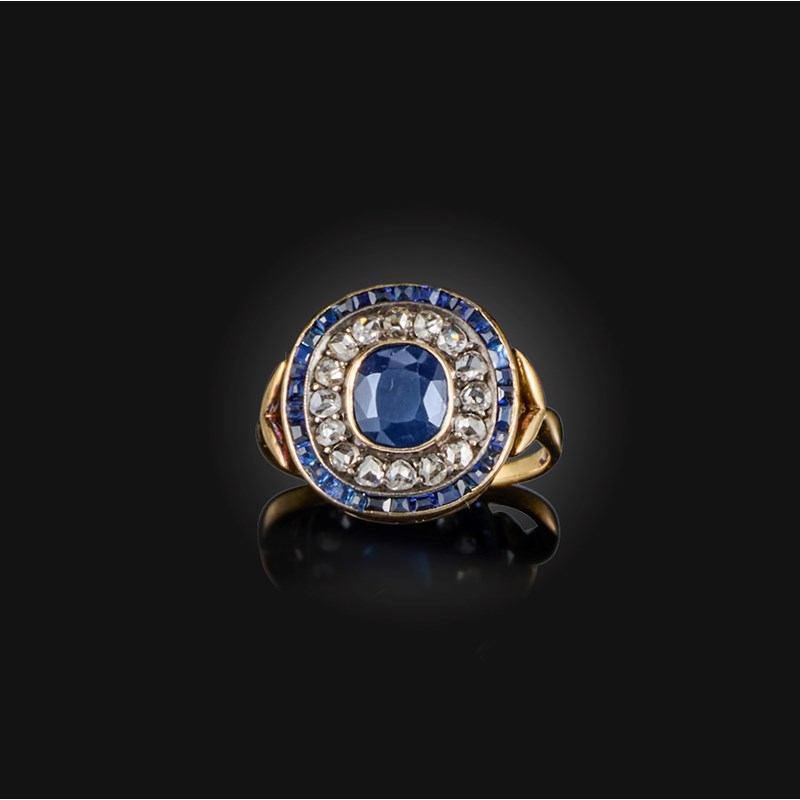 A sapphire and diamond ring, of target design, centring on a cushion-shaped sapphire, within concentric borders of rose-cut diamonds and channel-set calibré-cut sapphires, mounted in gold, size P, stamped 750