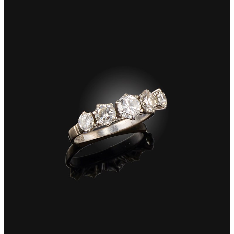 A five-stone diamond ring, claw-set with a sequence of five graduated brilliant-cut diamonds totalling approximately 1.20 carats, mounted in white gold, size M1/2, stamped 18CT