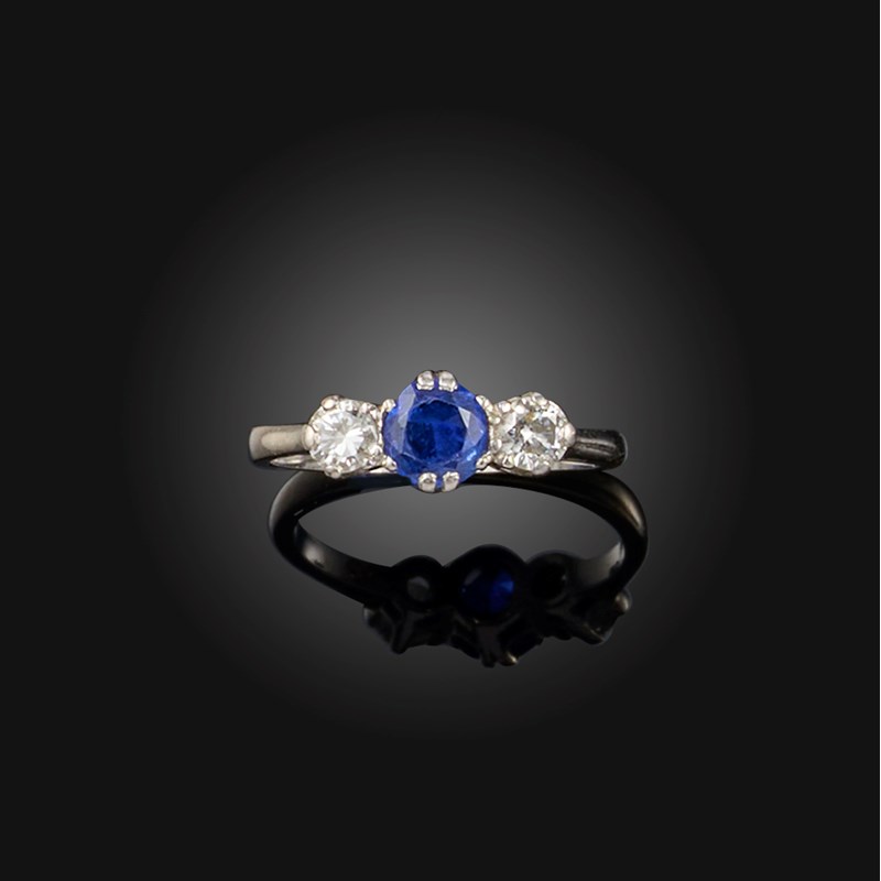 A sapphire and diamond ring, mid 20th century, claw-set with a circular-cut sapphire between brilliant-cut diamonds, mounted in platinum, size L, stamped PLAT